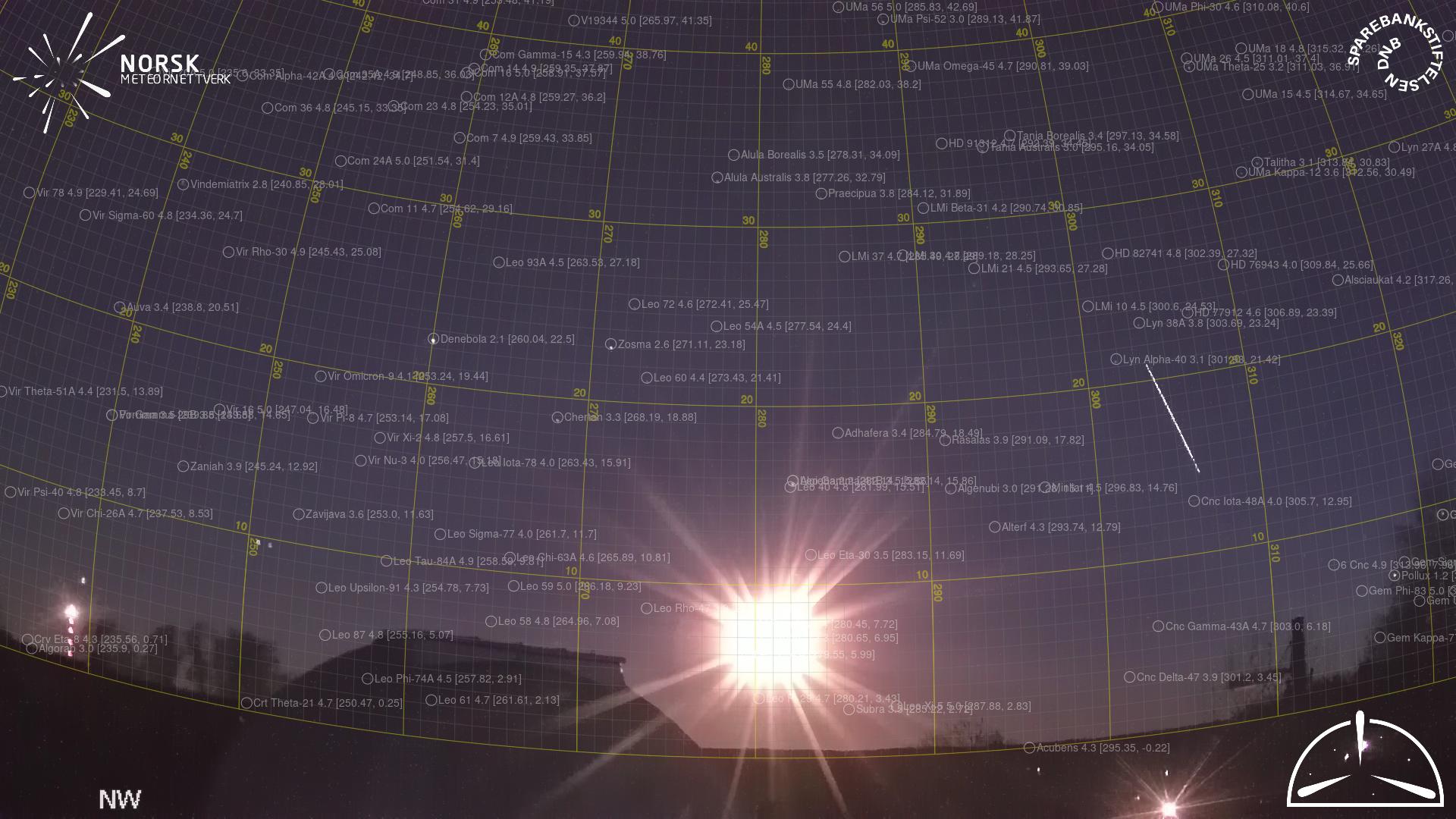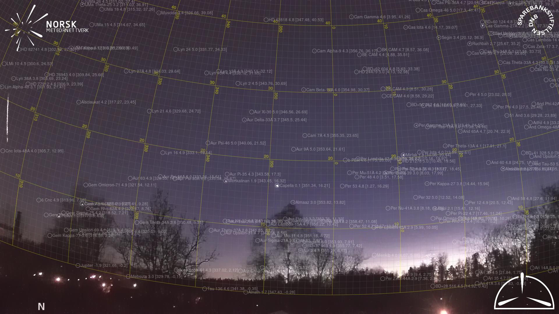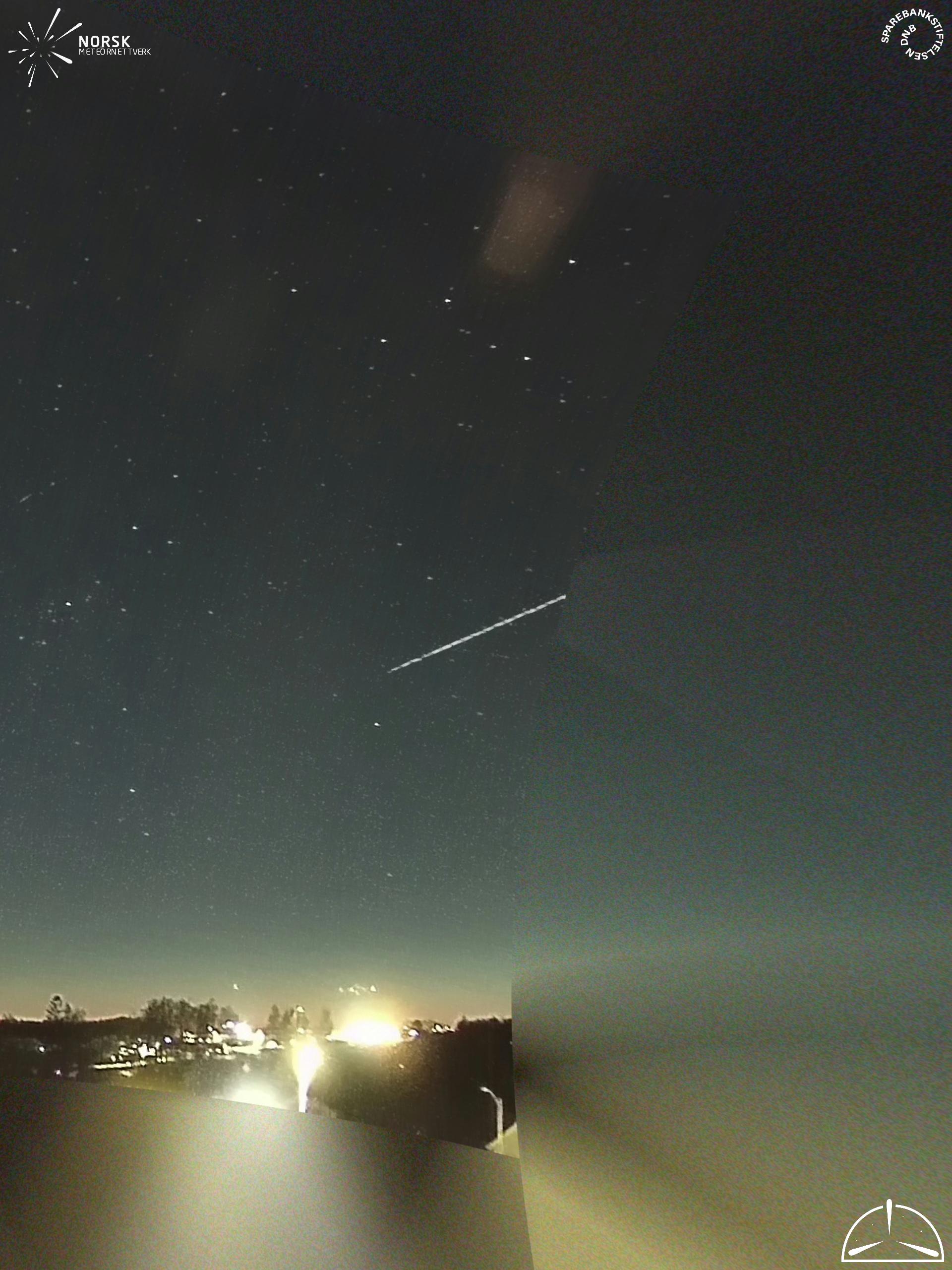 Kartet viser peilingene for meteoren. De lysere linjene viser retningene fra observasjonsstedene for meteorens tilsynekomst, og de mørkere linjene viser hvor den sist kunne sees. Den blå pila viser meteorens synlige ferd.